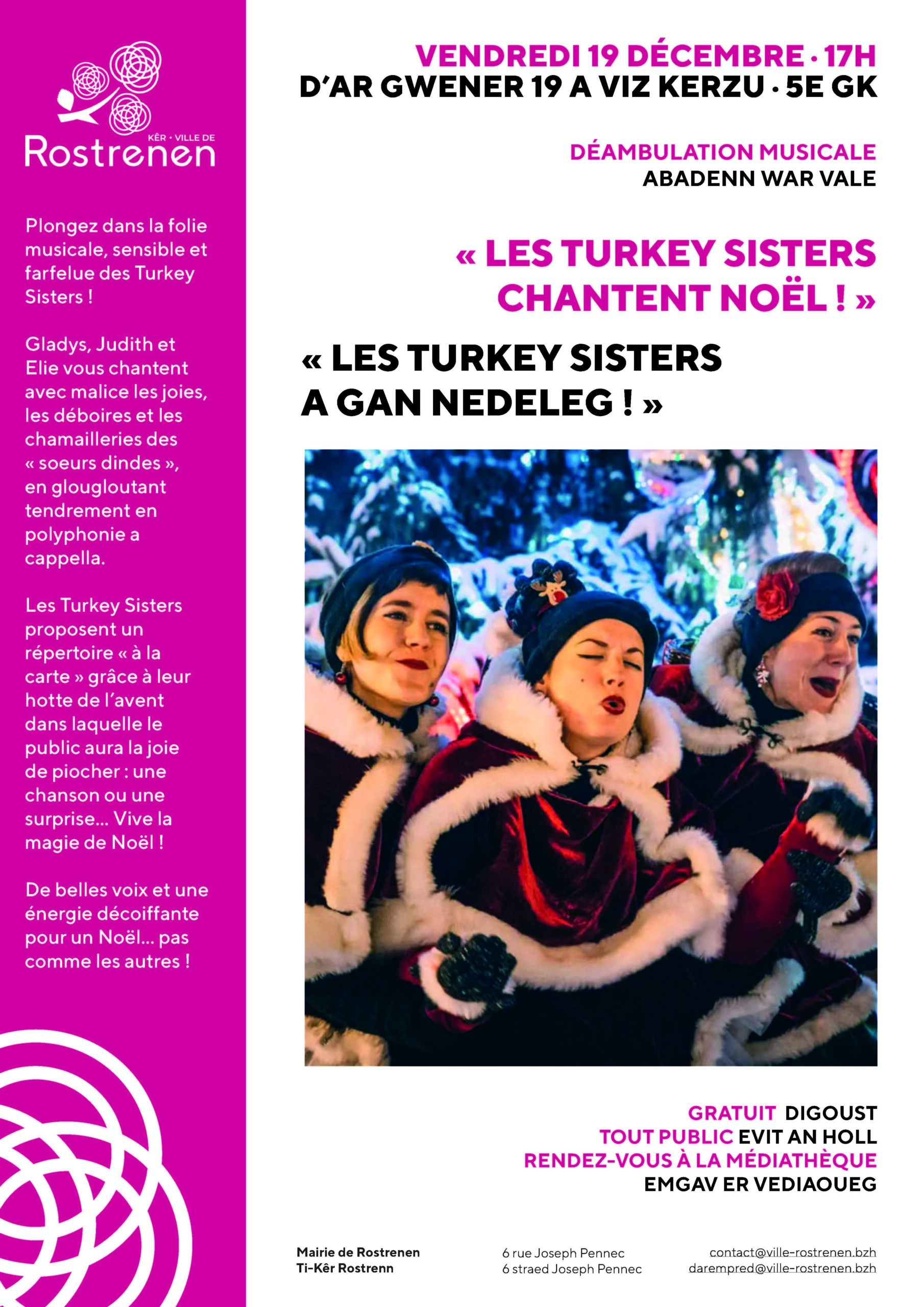 Les Turkey Sisters nous plongent dans l’univers d’un Noël féérique, mais pas que… elles proposent leur répertoire « à la carte » grâce à leur hotte de l’avent dans laquelle le public aura la joie de piocher : une chanson ou une surprise, vive la magie de Noël !