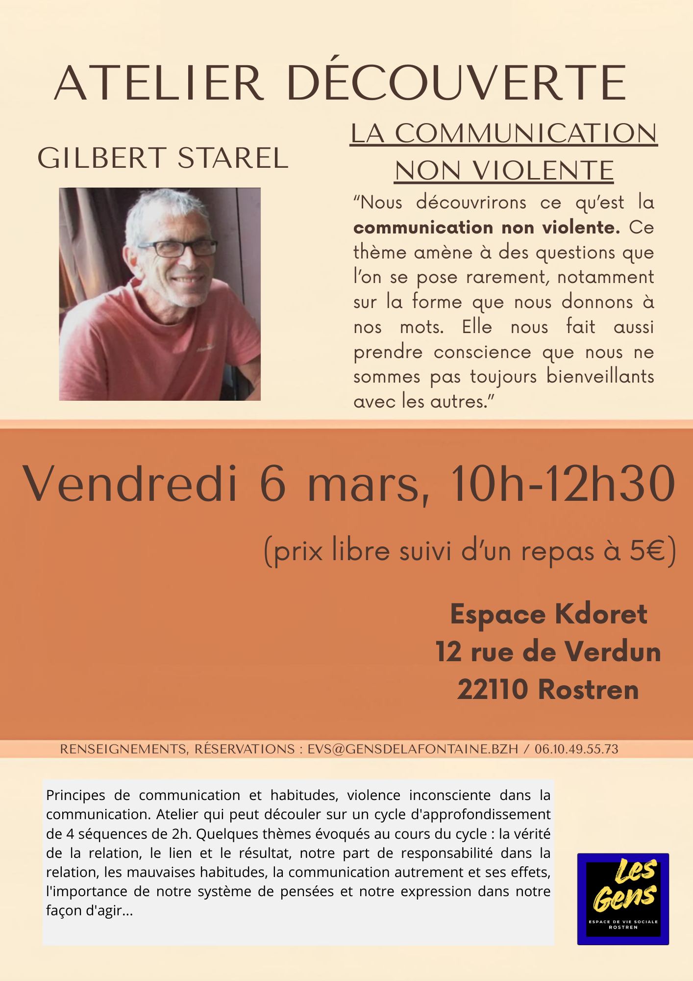 Atelier découverte Vendredi 6 mars 10h-12h30 Gilbert Starel est invité par l’Espace de Vie Sociale pour nous parler de communication non violente, suivi d’un repas. Réservations conseillées : evs@gensdelafontaine.bzh & 06 10 49 55 73 Espace Kdoret, 12 rue de Verdun Date 06 Mar 2026 Heure 10h00 - 12h30