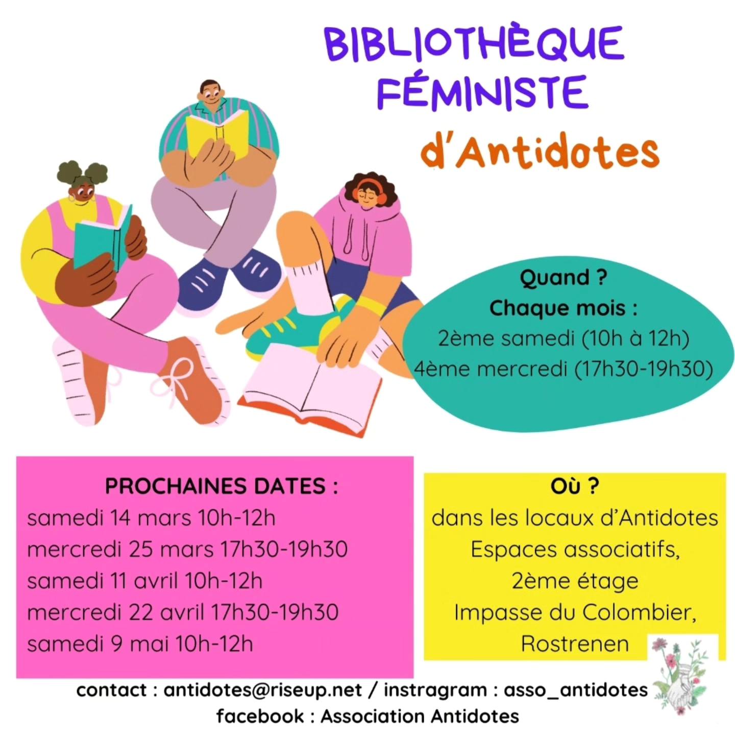 Bibliothèque féministe d’Antidotes Programme horaire Samedi 11 avril - 10h - 12h Mercredi 22 avril - 17h30 - 19h30 Date 11 - 22 Avr 2026