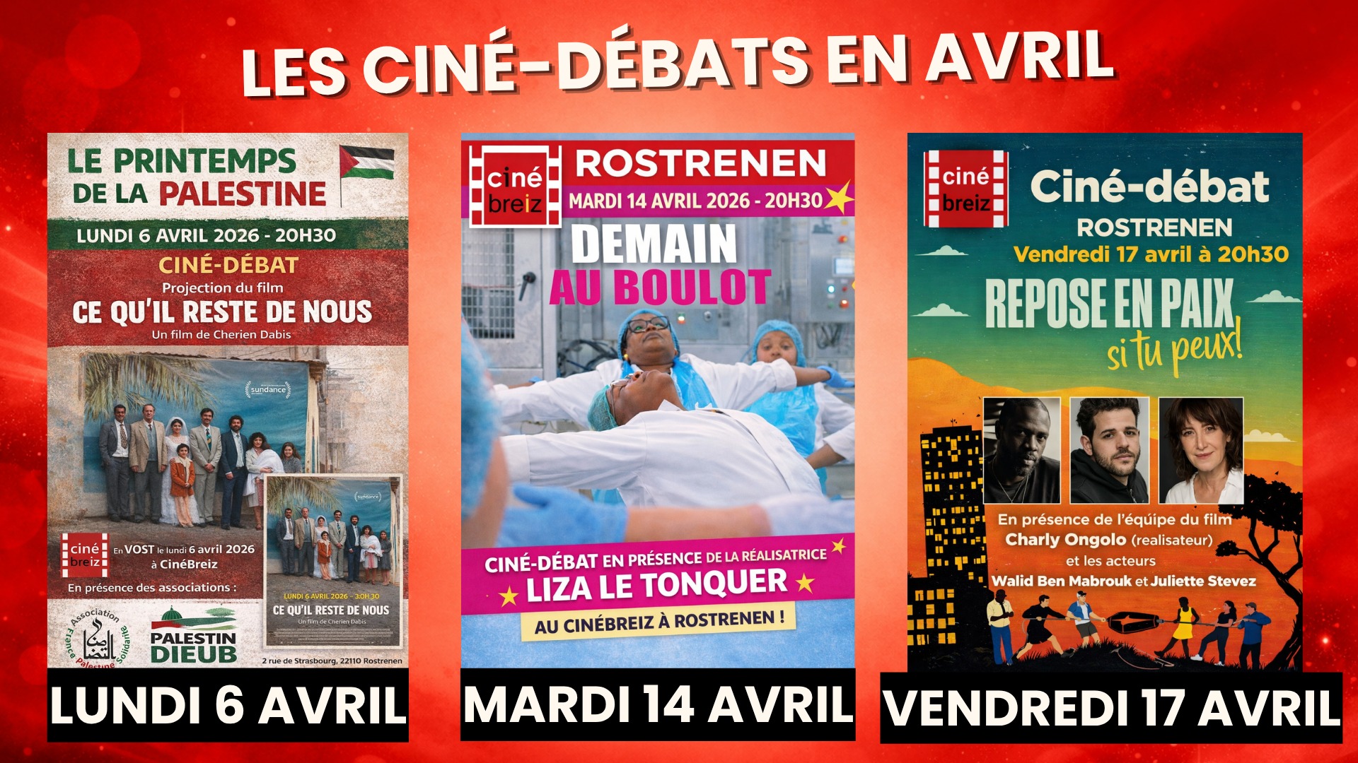 Ciné-débats au Ciné-Breiz En Avril au cinéma 3 Ciné-débats Ce qu’il Reste de Nous Lundi 6 Avril | 20h30 | VOST Demain au Boulot Mardi 14 Avril | 20h30 Repose en Paix Vendredi 17 Avril | 20h30 Date 06 - 17 Avr 2026