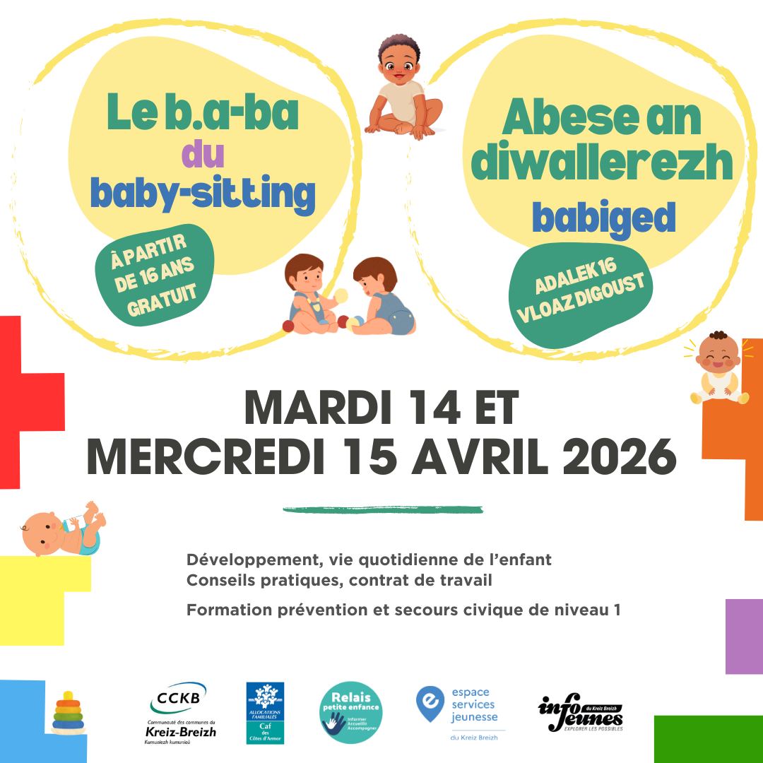 Le Relais Petite Enfance Rostrenen Rpe, le Service jeunesse de la Communauté de communes du Kreiz Breizh et l’#ESJduKB proposent un atelier gratuit « baby-sitting » sur une journée, suivi d’une journée de formation au PSC1, les 14 et 15 avril 2026, à Rostrenen, pour les jeunes à partir de 16 ans,