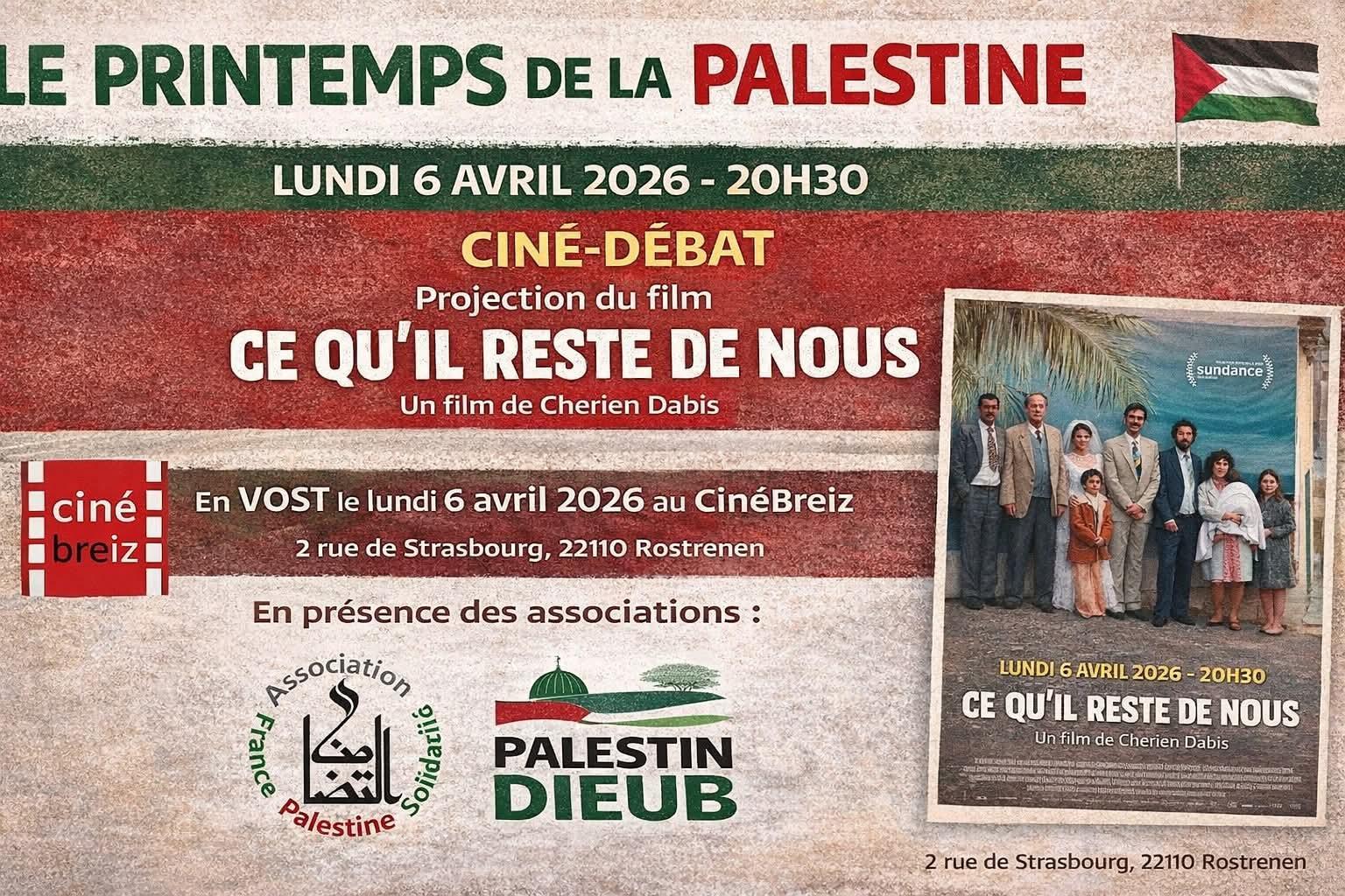 Printemps de la Palestine – projection Lundi 6 avril 20h30 Dans le cadre du Printemps de la Palestine, le Ciné Breiz et les associations France Palestine Solidarité et Palestine Dieub, organisent une projection du film « Ce qu’il reste de nous » de Cherien Dabis. Ciné Breiz Date 06 Avr 2026 Expiré! Heure 20h30