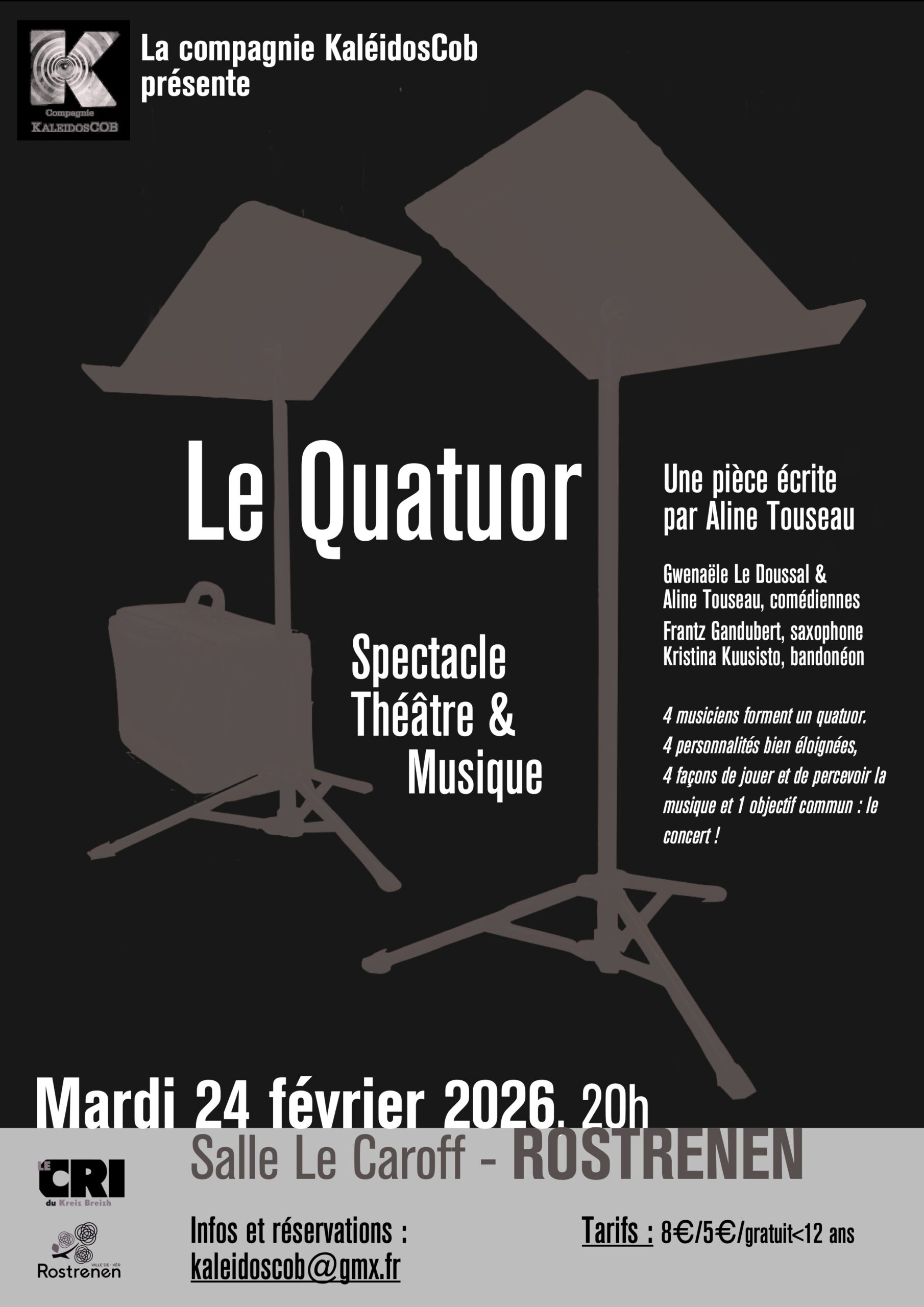 Écrite par Aline Touseau et créée le 15 novembre 2025 à St-Nicolas-du-Pélem, cette pièce mêle étroitement théâtre et musique avec une dose d’humour parfois grinçant de réalisme.