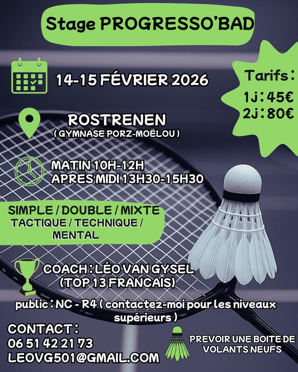 Après le succès de la première édition, PROGRESSO’BAD revient pour un nouveau week-end 100 % badminton. Que ce soit pour te faire plaisir, progresser ou te challenger, ce stage est fait pour toi !